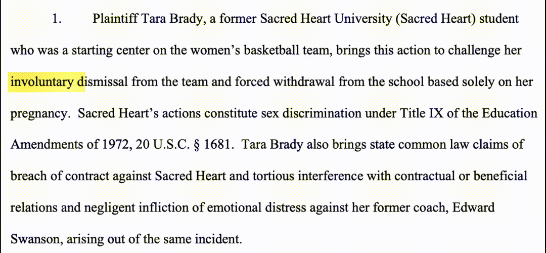 Tara Brady, a starting center on the Sacred Heart University women’s basketball team, settled her lawsuit against the school on accusations that they forced her to quit the team and rescinded her scholarship because of her pregnancy.